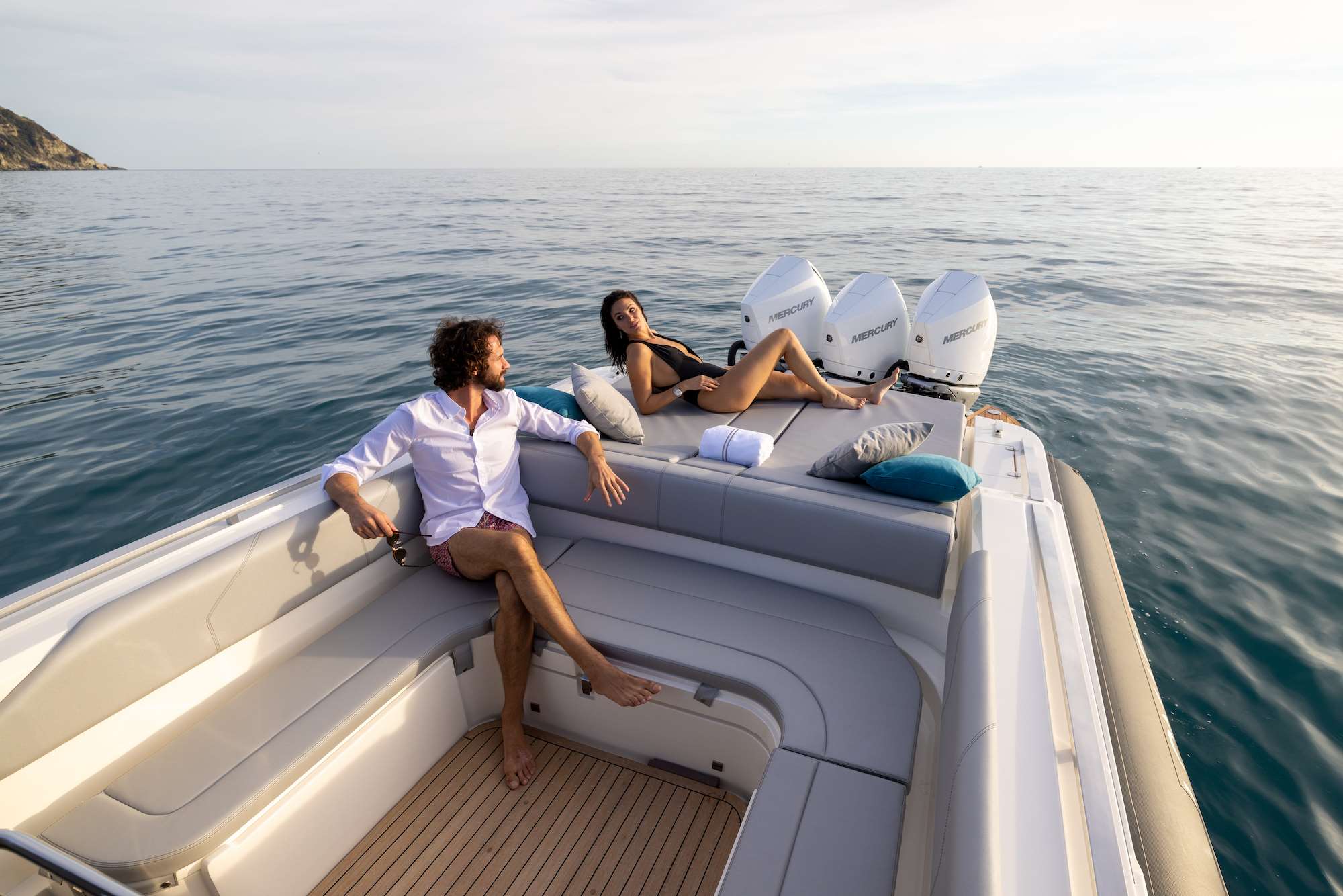 Propulsé par 3 Mercury Verado V8 de 300 CV, soit 900 CV au total, ce GranTurismo 12.5 offre des accélérations impressionnantes et une tenue de mer irréprochable. Sa carène en V profond assure stabilité et confort, même à grande vitesse.